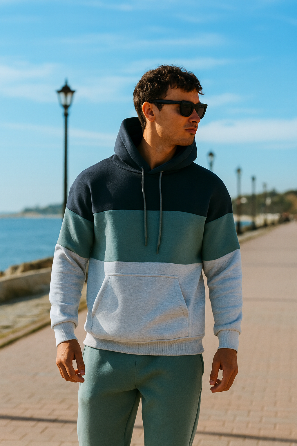 Oversize Su Yeşili Renk Füme Şeritli Kapüşonlu Eşofman Takımı